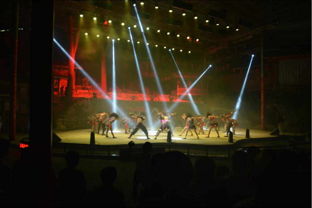 【漓水古越】是以展示廣西少數(shù)民族民俗風(fēng)情為主題的大型民族表演,它集漓江山水、廣西少數(shù)民族文化及現(xiàn)代藝術(shù)創(chuàng)作,選用"真山真水"做為實(shí)景舞臺(tái)。 展現(xiàn)出了少數(shù)民族的"銅鑼文化""繡球文化" "山歌文化"等多種文化的表演。